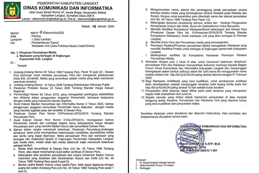 AXIALNEWS.id | Puluhan wartawan di Kabupaten Langkat resah atas dugaan pelanggaran regulasi surat edaran Kadis Kominfo Pemkab Langkat Nomor : 500-12-18/Diskominfo/2025.