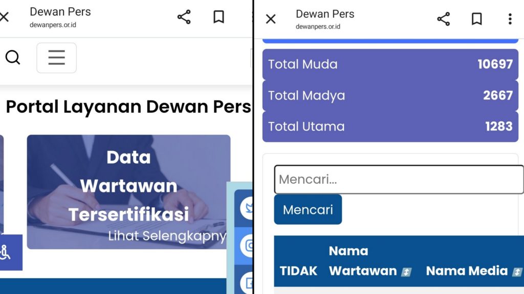 Teks Foto: Halaman website dewanpres.or.id untuk melihat data wartawan berserikat UKW beserta tingkatannya.